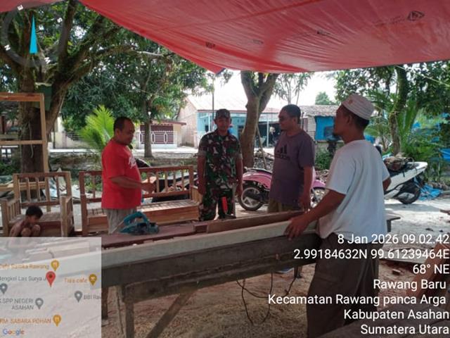 Dalam rangka mempererat tali silaturrahiim dan membangun kerjasama yang baik dengan seluruh lapisan masyarakat di wilayah binaannya, dalam kesempatan ini seperti yang dilakukan oleh Personel Bintara Pembina Desa (Babinsa) Koramil 18/Meranti jajaran Kodim 0208/Asahan Kopda Dedi Susanto turun kewilayah binaan untuk melaksanakan kegiatan Komunikasi Sosial (Komsos) bersama dengan warga binaan, kegiatan Komsos bersama dengan Pengerajin Kayu, Komsos dengan pengerajin kayu warga masyarakat, adapun maksud dan tujuan, untuk bersilaturahmi serta memberi motivasi kepada pengerajin kayu agar lebih berkarya supaya usaha nya dapat lebih berkembang dan maju, bersama dengan Bapak Kadek (warga dusun Vl), Bapak Adi (Warga dusun Vl) dan Bapak Sunarto (warga dusun Vl), kegiatan tersebut yang dilaksanakan bertempat di Dusun Vll Desa Rawang Pasar VI Kecamatan Rawang Panca Arga Kabupaten Asahan, Kamis (08/01/2026).