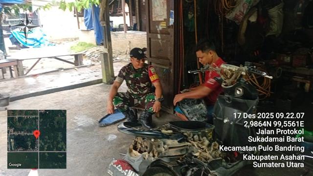 Asahan  |  Dalam rangka untuk membangun Komsos ini harus disemua golongan, dari muda hingga yang tua, tujuannya agar menciptakan lingkungan yang aman tentram dan nyaman, sehingga mudah terkendali jika terjadi sesuatu, dalam hal ini Personel Bintara Pembina Desa (Babinsa) Koramil 18/Meranti jajaran Kodim 0208/Asahan Serma Jalil turun kewilayah binaan untuk melaksanakan kegiatan Komunikasi Sosial (Komsos) bersama dengan warga masyarakat binaan, kegiatan komsos dengan warga desa binaan serta pemilik usaha bengkel sepeda motor, kegiatan komsos memberikan motivasi ke Pemilik Bengkel guna mendorong pengembangan usaha yang ditekuni, usaha bengkel Sepeda Motor Bapak Suryo lumayan ramai pelanggan kualitas hasil kerja dan terjamin dan tidak mematok harga tinggi, Babinsa di tuntut harus selalu peduli dan siap membantu masyarakat yang membutuhkan, bersama dengan Bapak Suryo (Pemilik bengkel), kegiatan tersebut yang dilaksanakan bertempat di Dusun VII Jalan Protokol Desa Suka Damai Kecamatan Pulo Bandring Kabupaten Asahan, Rabu (17/12/2025).