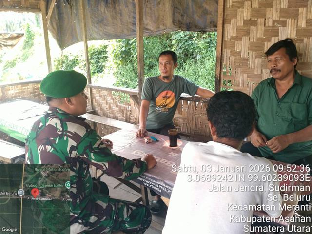Asahan | Para Babinsa melaksanakan Komsos dalam rangka menjaga hubungan yang harmonis dengan masyarakat diwilayah binaan dengan melakukan kegiatan Komunikasi Sosial bersama warga Desa, Komsos ini dilakukan sebagai upaya mempererat tali silaturahmi serta meningkatkan kedekatan antara TNI dengan masyarakat di wilayah binaan, melalui kegiatan tersebut Babinsa dapat mengetahui perkembangan situasi wilayah sekaligus menyerap aspirasi dan kebutuhan warga, dalam kesempatan ini seperti yang dilakukan oleh Bintara Pembina Desa (Babinsa) Koramil 18/Meranti jajaran Kodim 0208/Asahan Kopda M Wendi Purnomo turun kewilayah binaan untuk melaksanakan kegiatan Komunikasi Sosial (Komsos) bersama dengan warga masyarakat di Wilayah desa binaan, Komsos membahas tentang situasi pasca menyambut Tahun Baru dimana situasi aman dan kondusif dan diharapkan di Tahun ini perekonomian masyarakat meningkat lebih baik dan tetap juga terjaga keamanan dan ketertiban, kegiatan Komsos dengan warga Bapak Surbakti, Bapak Tambunan dan Bapak Purba, kegiatan tersebut yang dilaksanakan bertempat di Desa Sei Bluru Kecamatan Meranti Kabupaten Asahan, Sabtu (03/01/2026).