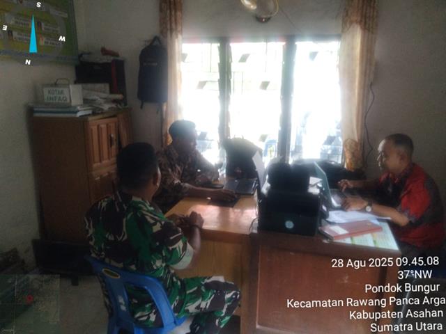 Asahan | Untuk menciptakan dan meningkatkan kerja sama yang baik serta menjalin hubungan antara TNI dan aparatur desa serta untuk menciptakan kemanunggal TNI dengan Rakyat, dalam kesempatan tersebut seperti hal yang dilakukan oleh Personel Bintara Pembina Desa (Babinsa) Koramil 18/Meranti jajaran Kodim 0208/Asahan Serda Eko Hardika turun kewilayah binaan untuk melaksanakan kegiatan Komunikasi Sosial (Komsos) bersama dengan perangkat Desa untuk menjalin silaturahim antara Babinsa dan aparat Desa dan untuk mengetahui permasalahan yang ada diwilayah desa binaan, Komunikasi Sosial (Komsos) dengan warga bersama perangkat desa kegiatan ini bertujuan meningkatkan hubungan kerjasama dan silaturahmi antara perangkat desa dengan Babinsa sebagai pembinaan teritorial di desa binaan, dan juga meningkatkan kordinasi serta membangun komunikasi dengan baik dengan tokoh masyarakat, bersama dengan Bapak Dani Kaur Perencanaan dan Bapak Sugi Sekdes, kegiatan tersebut yang dilaksanakan bertempat di Kantor Desa Pondok Bungur Kecamatan Rawang Panca Arga Kabupaten Asahan, Kamis (28/08/2025).