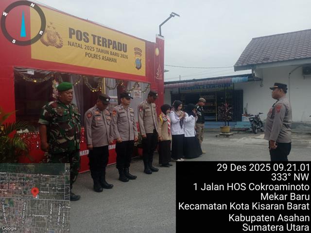 Dengan melaksanakan Pos Pengamanan terpadu dalam rangka menjaga kamtibmas di wilayah Kabupaten Asahan menjelang Hari Natal dan Tahun Baru 2025-2026, Dalam kegiatan mendampingi dan membantu Personel Polres Kabupaten Asahan untuk melaksanakan kegiatan Pos PAM Terpadu Natal 2025 dan Tahun Baru 2026 tersebut bersama dengan Personel Gabungan diantaranya adalah Personel TNI : 1 orang, Personel Polri : 6 orang, Personel Dishub : – orang, Personel Pol PP : 1 orang dan Kesehatan : 2 orang, untuk situasi Lalulintas aman dan lancar, Penanggung Jawab Pos Yan Pam NATARU Padal Ipda Rizon Gultom.