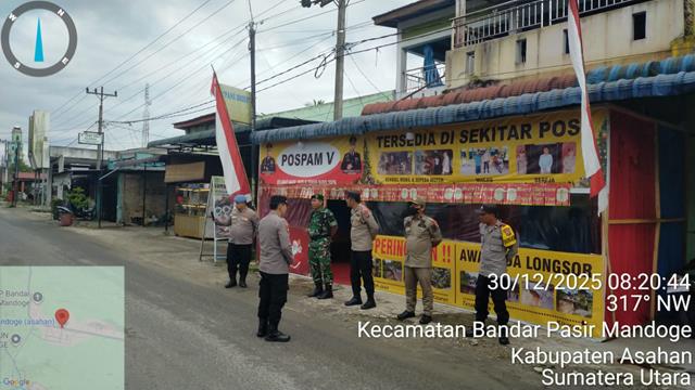 Asahan | Dalam rangka untuk tertibkan keamanan wilayah, dalam kesempatan ini seperti yang dilakukan oleh Personel Bintara Pembiona Desa (Babinsa) Koramil 14/Bandar Pasir Mandoge jajaran Kodim 0208/Asahan Serma P Marpaung turut serta melaksanakan kegiatan Apel Gabungan kegiatan Pos Pam Nataru, kegiatan Pos PAM Nataru di Wilayah Koramil 14/Bandar Pasir Mandoge, dengan melaksanakan Pos Yan Pam V NATARU Tahun 2025-2026, kegiatan tersebut yang dilaksanakan bertempat di Dusun Il Jalinsum Asahan-Simalungun Desa Bandar Pasir Mandoge Kecamatan Bandar Pasir Mandoge Kabupaten Asahan, Selasa (30/12/2025).