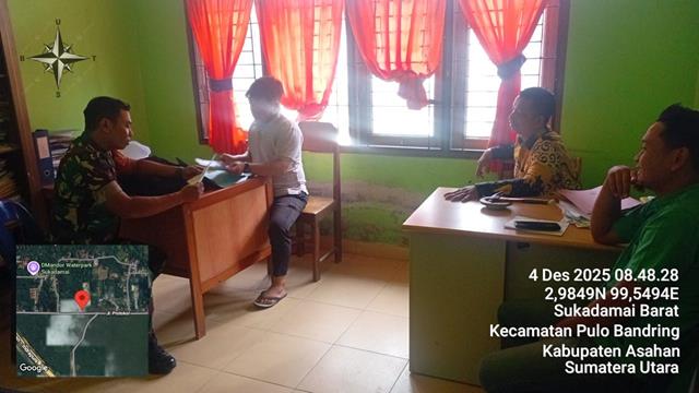 Asahan | Dalam rangka membicarakan tentang Pendataan Jumlah Penduduk yang baru pindah dan yang telah meninggal dunia untuk perbaharuan data, pada kesempatan tersebut Babinsa dapat mengetahui jumlah penduduk yang baru dan meninggal dunia di setiap Desa binaan, dalam kesempatan ini seperti yang dilakukan oleh Personel Bintara Pembina Desa (Babinsa) Koramil 18/Meranti jajaran Kodim 0208/Asahan Serma Jalil turun kewilayah binaan untuk melaksanakan kegiatan Pul Data Ter diwilayah di desa binaan, agar terjalin hubungan yang erat antara Babinsa dan perangkat desa, kegiatan Puldatater di kantor Desa guna mengetahui perubahan data-data diwilayah binaan, Puanter untuk menggali informasi informasi yang berkembang di lingkungan masyarakat binaan terkait perkembangan situasi keamanan dan ketertiban masyarakat, bersama dengan Sekdes Suka Damai (Bapak M Fitrah), Ka Umum (Bapak Mijan) dan Kasi Pem (Bapak Candra), kegiatan tersebut yang dilaksanakan bertempat di Kantor Desa Jalan Protokol Desa Suka Damai Kecamatan Pulo Bandring Kabupaten Asahan, Kamis (04/12/2025).