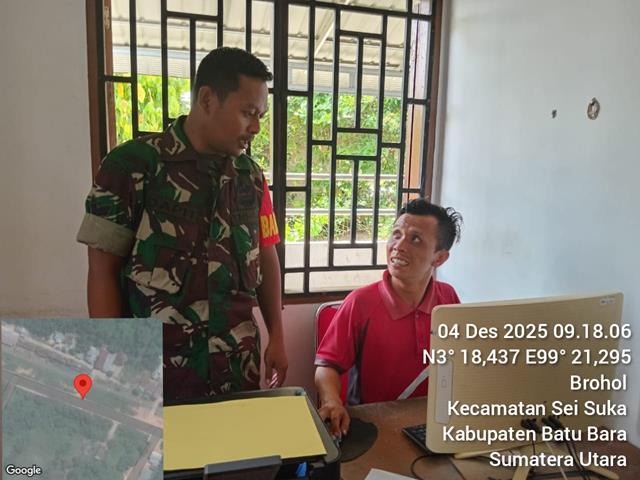 Asahan | Dalam rangka untuk memelihara dan membantu masyarakat Desa serta untuk menjalin Silahturrahmi yang erat bersama masyarakat, untuk meningkatkan sinergitas di wilayah binaanya, pada kesempatan ini seperti yang dilakukan oleh Personel Bintara Pembina Desa (Babinsa) Koramil 15/Bandar Pulau jajaran Kodim 0208/Asahan Sertu David Purba turun kewilayah binaan untuk melaksanakan kegiatan Pul Data Ter pengecekan Geo Demo Konsos, kegiatan ini Bertujuan untuk mengetahui perubahan dan penambahan jumlah Aparatur Pemerintah, kegiatan ini bertujuan untuk mengetahui perkembangan wilayah Geo, Demo, Konsos serta mempererat hubungan silaturrahmi antara Babinsa dengan perangkat Desa binaan, kegiatan Geo, Demo dan Konsos bersama Operator Desa Bapak Reza, kegiatan tersebut yang dilaksanakan bertempat di Kantor Desa Brohol Kecamatan Sei Suka Kabupaten Batu Bara, Kamis (04/12/2025).