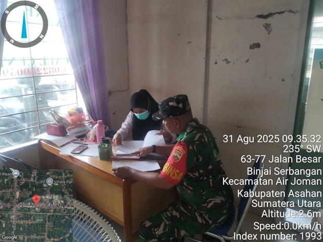 Asahan | Para Babinsa harus aktif melaksanakan Giat Puldata Ter, karena Data Teritorial penting bagi terlaksananya kegiatan Pembinaan Teritorial sesuai Program Kerja Koramil dan harus selalu diperbaharui agar mempunyai Data terbaru tentang wilayah, guna mendukung kelancaran pelaksanaan tugas pokok dalam melakukan pembinaan teritorial serta mengetahui perubahan yang ada diwilayah binaan, dalam kesempatan ini seperti yang dilakukan oleh Personel Bintara Pembina Desa (Babinsa) Koramil 07/Air Joman jajaran Kodim 0208/Asahan Serda Alexander Sitepu turun kewilayah binaan untuk melaksanakan kegiatan Pengumpulan Data Teritorial Geo, Demo dan Konsos, dalam rangka untuk mempermudah memperoleh data terbaru yang diperlukan, meliputi Data Geografi, Demografi dan Data Kondisi sosial masyarakat di wilayah binaan, pengecekan data data terbaru dan kordinasi masalah stanting, pengumpulan data Stanting dengan perangkat Puskesmas, pengumpulan data Stanting dengan perangkat Puskesmas, bersama dengan Ibu Rahma (Bindes), kegiatan tersebut yang dilaksanakan bertempat di Kantor Puskesmas Binjai Serbangan Kecamatan Air Joman Kabupaten Asahan, Minggu (31/08/2025).