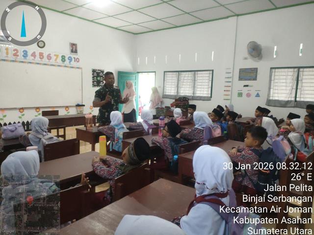 Guna penyiapan Siswa-siswi untuk memberikan Pengetahuan Wawasan Kebangsaan tentang memupuk rasa cinta tanah air dan menjalankan kedisiplinan di sekolah, dalam kesempatan ini seperti halnya yang dilakukan oleh Personel Bintara Pembina Desa (Babinsa) Koramil 07/Air Joman jajaran Kodim 0208/Asahan Serda Armain S turun kewilayah binaan untuk melaksanakan kegiatan Wasbang kepada Murid Sekolah Dasar dengan memberikan pengarahan kepada Siswa siswi tentang wawasan kebangsaan dan cinta tanah air, materi Wawasan Kebangsaan kepada Siswa/i di SD S AL Hadi Islamic School, kegiatan ini sangatlah penting ditanamkan sejak dini sebagai seseorang yang nantinya akan menjadi generasi penerus bangsa dengan harapan dapat di publikasikan oleh para siswa/siswi dalam kehidupan sehari-hari,baik itu dilingkungan sekolah maupun di lingkungan keluarga dan masyarakat sebagai wujud keberhasilan sinergitas antara Babinsa dengan para guru di sekolah, bersama dengan Ibu Syahriani (Kepala Sekolah) dan Ibu Siti Rahmah (Guru/Wali kelas), kegiatan tersebut yang dilaksanakan bertempat di SD S AL Hadi Islamic School Lingkungan V Kelurahan Binjai Serbangan Kecamatan Air Joman Kabupaten Asahan, Jumat (30/01/2026).