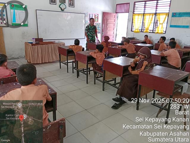Guna penyiapan Siswa-siswi untuk memberikan Pengetahuan Wawasan Kebangsaan tentang memupuk rasa cinta tanah air dan menjalankan kedisiplinan di sekolah, dalam kesempatan ini seperti halnya yang dilakukan oleh Personel Bintara Pembina Desa (Babinsa) Koramil 10/Sei Kepayang jajaran Kodim 0208/Asahan Koptu MD Sihombingturun kewilayah binaan untuk melaksanakan kegiatan Wasbang kepada Murid Sekolah Dasar, dengan memberikan pengarahan kepada siswa/i tentang wawasan kebangsaan dan cinta tanah air, kegiatan wanwil bersama anak sekolah dasar, kegiatan Binwanmil kepada siswa SD N 010013 desa Sei kepayang kanan untuk memberikan bimbingan dan arahan agar lebih giat dalam belajar dan semakin disiplin dalam belajar, agar dapat menggapai cita- cita yang diimpikan supaya dapat berguna bagi keluarga dan masyarakat sekitar juga Bangsa serta Negara, bersama dengan Siswa SD N 010013, kegiatan tersebut yang dilaksanakan bertempat di SD 010013 Sei Kepayang Kanan Kecamatan Sei Kepayang Kabupaten Asahan, Sabtu (29/11/2025).