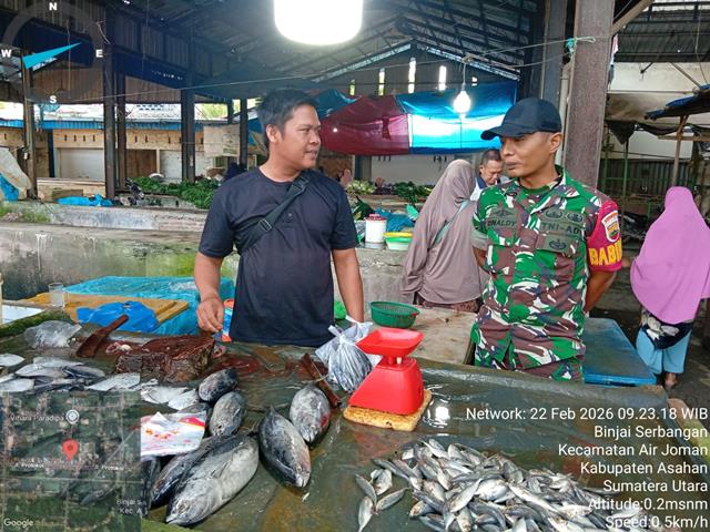 Dalam rangka untuk tetap menjaga keamanan dan ketertiban, dalam kesempatan ini seperti yang dilakukan oleh Personel Bintara Pembina Desa (Babinsa) Koramil 07/Air Joman jajaran Kodim 0208/Asahan Serda Rinaldi Asmar Tanjung turun kewilayah binaan untuk melaksanakan kegiatan Komunikasi Sosial (Komsos) bersama dengan pedagang guna mengecek harga sembako, dengan melaksanakan kegiatan Puanter bersama dengan Bapak Abdi (Pedagang ikan) dan Ibu Murni (Pedagang ikan), kegiatan tersebut yang dilaksanakan bertempat di Pasar Tradisional Binjai Serbangan Kecamatan Air Joman Kabupaten Asahan, Minggu (22/01/2026).
