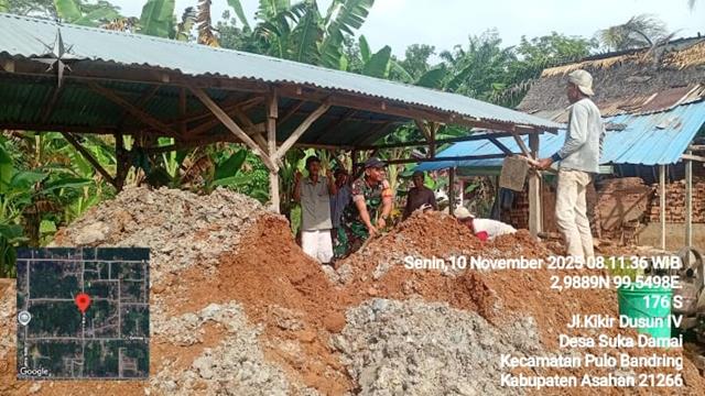 Dalam kesempatan ini seperti halnya yang dilakukan oleh Personel Bintara Pembina Desa (Babinsa) Koramil 18/Meranti jajaran Kodim 0208/Asahan Serma Jalil turun kewilayah binaan untuk melaksanakan kegiatan Komunikasi Sosial (Komsos) bersama dengan penjual dan yang mau membeli Batu-bata untuk pembuatan rumah dan warung, dengan melaksanakan komsos dengan warga desa binaan untuk mengetahui kegiatan pekerjaan warga yang dapat membantu perekonomian mereka dan untuk mempererat hubungan silaturrahmi Babinsa dan warga desa binaan, kegiatan Gotong-royong  membantu warga mencetak batu bata untuk pembuatan rumah, Babinsa turun langsung ke lokasi pembuatan batu bata untuk membantu warga dalam proses pencetakan, pengeringan, dan penyusunan batu bata. Kegiatan ini dilakukan sebagai bentuk kepedulian Babinsa, kegiatan ini diharapkan dapat memotivasi warga untuk terus bergotong royong dan mempererat hubungan antara Babinsa dengan Masyarakat, Bersama dengan Bapak Karmen (Pemilik Rumah) dan Warga Desa Suka Damai, kegiatan tersebut yang dilaksanakan bertempat di Desa Suka Damai Kecamatan Pulo Bandring Kabupaten Asahan, Senin (10/11/2025).