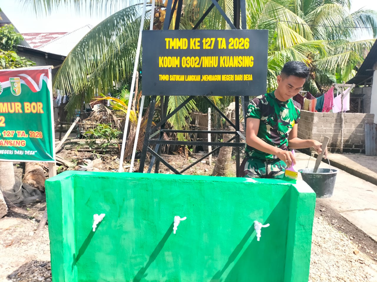 Teluk Kuantan – Program TNI Manunggal Membangun Desa (TMMD) ke-127 Kodim 0302/Inhu terus berupaya meningkatkan akses air bersih bagi masyarakat. kegiatan TMMD difokuskan pada pembuatan sumur bor di Dusun 2 Desa Koto Rajo, Kecamatan Kuantan Hilir Seberang, Kabupaten Kuantan Singingi. Dengan fokus pada pengecatan tempat kran air untuk memeperindah tampilannya. Minggu (01/03/2026).