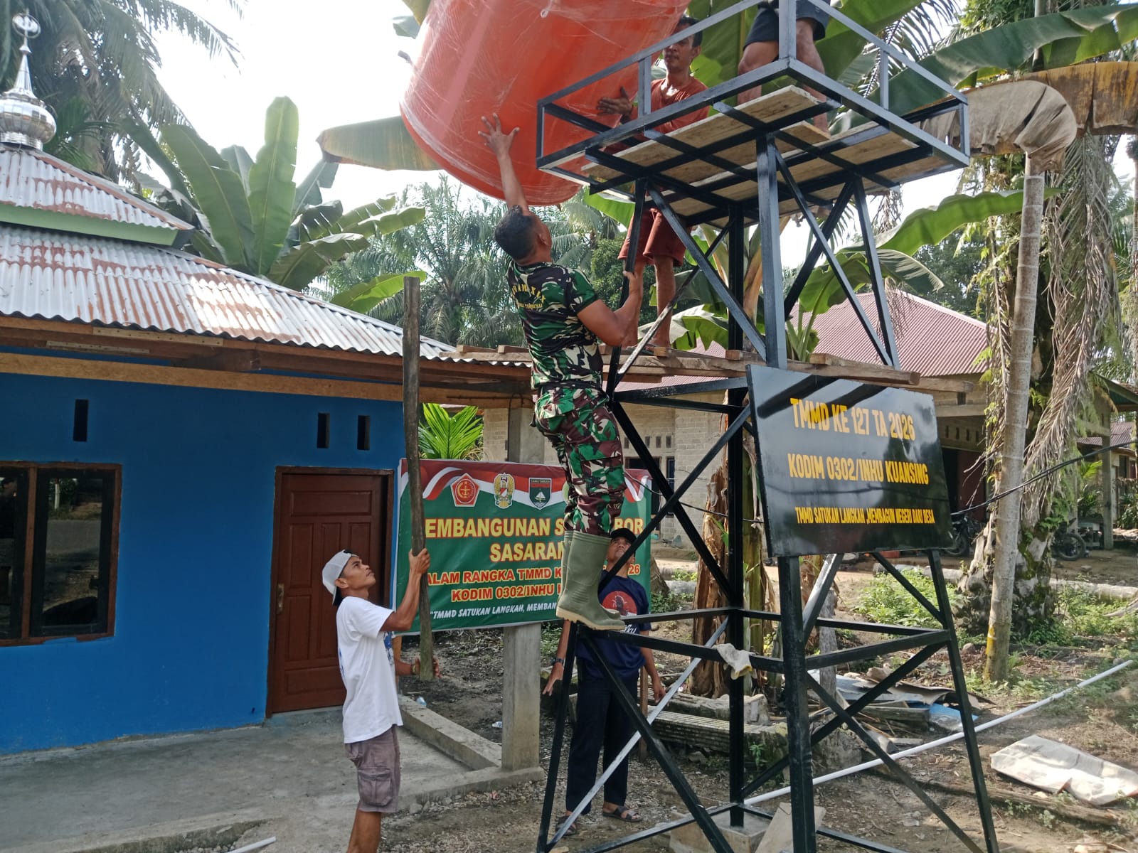 Teluk Kuantan – Satuan Tugas Pembangunan Masyarakat Desa (TMMD) Kodim 0302/Inhu melaksanakan Tahap Pemasangan Tangki Penampungan Air di Atas Tower besi untuk kelengkapan Sumur Bor di Mushala Nurul Alif, Desa Perhentian Luas, Kecamatan Logas Tanah Darat, Kabupaten Kuantan Singingi, Kamis (26/02/2026).