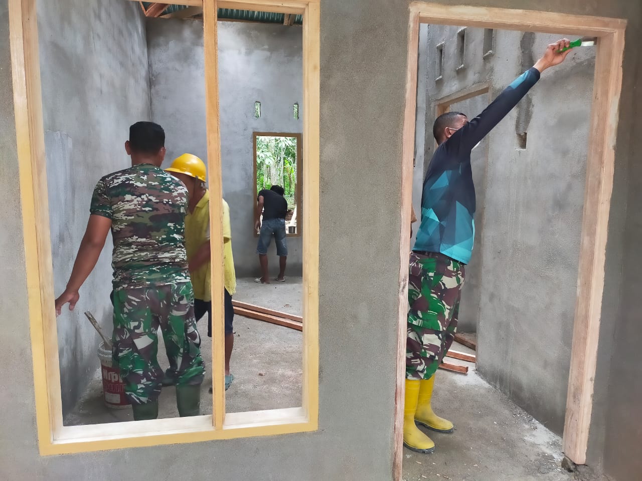Satgas TMMD Ke-127 Kodim 0302/Inhu bersama dengan warga tampak penuh semangat dan kompak mengerjakan kerangka Plafon rumah, Cat Dasar Dinding dan Cat Konsen RTLH milik Bapak Hamidan di desa Tanjung.