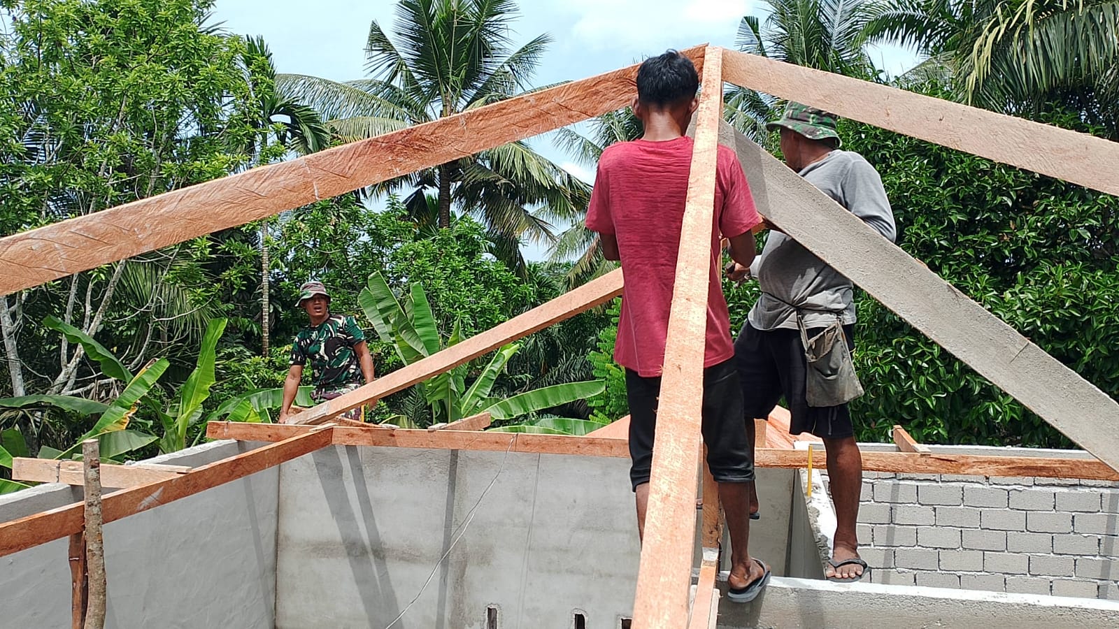 Salah satu bukti nyata yang dikerjakan Satgas TMMD bersama masyarakat adalah pembangunan RTLH Saat ini prajurit TNI dibantu masyarakat sedang melakukan pemasangan kuda-kuda jika sudah selesai semua akan dilanjutkan dengan pemasangan atap serta kaca kusen jendela maupun pintu.