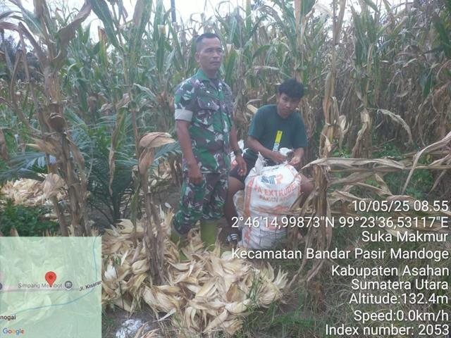 Dalam kesempatan ini seperti halnya yang dilakukan oleh Personel Bintara Pembina Desa (Babinsa) Koramil 14/Bandar Pasir Mandoge jajaran Kodim 0208/Asahan Serka L Siringo Ringo turun kewilayah desa binaan untuk turut serta melaksanakan kegiatan komsos bersama warga binaan yang sedang memanen jagung, sebagai Babinsa membantu dan memberikan dukungan agar bisa meningkatkan hasil ketahanan pangan hasil jagung di wilayah binaan bersama masyarakat melaksanakan pendampingan ketahanan pangan (Hanpang) jenis tanaman jagung hibrida membantu masyarakat melaksanakan  panen jagung jenis hibrida untuk mendukung program pemerintah agar Indonesia menjadi lumbung pangan dunia, kegiatan ini bertujuan agar terjalin hubungan yang baik antara Babinsa dengan warga binaannya sehingga tercipta hubungan dan kerja sama yang baik dan TNI semakin di cintai rakyat, bersama dengan Ibu Berta Boru Silalahi, Bapak Joni Huta Galung dan Bapak Marudut Manurung, kegiatan tersebut yang dilaksanakan bertempat di Dusun VIII Desa Suka Makmur Kecamatan Bandar Pasir Mandoge Kabupaten Asahan, Minggu (11/05/2025).