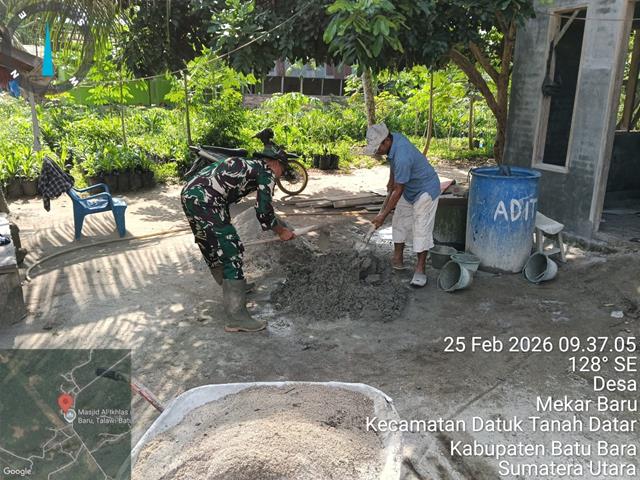 Batu Bara  |  Sebagai wujud kemanunggalan TNI dan Rakyat, hal ini sudah menjadi tugas dan tanggung jawab kami sebagai Babinsa untuk membantu meringankan beban masyarakat. Oleh karenanya, kami dituntut sigap dan tanggap atas segala kesulitan yang dihadapi warga, sehingga dapat terwujud kekompakkan, keharmonisan dan kemanunggalan TNI-Rakyat, dalam kesempatan ini seperti yang dilakukan oleh Personel Bintara Pembina Desa (Babinsa) Koramil 04/Talawi jajaran Kodim 0208/Asahan Serka Nanda Pebru turun kewilayah binaan untuk melaksanakan kegiatan Gotong royong bersama masyarakat dalam pembenahan membuat rumah warga desa binaan, kegiatan perehaban dan perbaikan rumah masyarakat di Desa Binaan, dengan membantu warga Desa membangun rumah agar meringankan biaya dan mempercepat penyelesaian pembangunan, dalam rangka untuk memelihara dan menjalin hubungan yg baik Antara Babinsa dengan Masyarakat desa Binaan, menciptakan lingkungan yang baik dan nyaman serta untuk meningkatkan Kemanunggalan TNI dan Rakyat, bersama dengan Bapak Bambang (Pemilik rumah) dan Bapak Supri (Tukang bangunan), kegiatan tersebut yang dilaksanakan bertempat di Dusun V Desa Mekar Baru Kecamatan Datuk Tanah Datar Kabupaten Batu Bara, Rabu (25/02/2026).