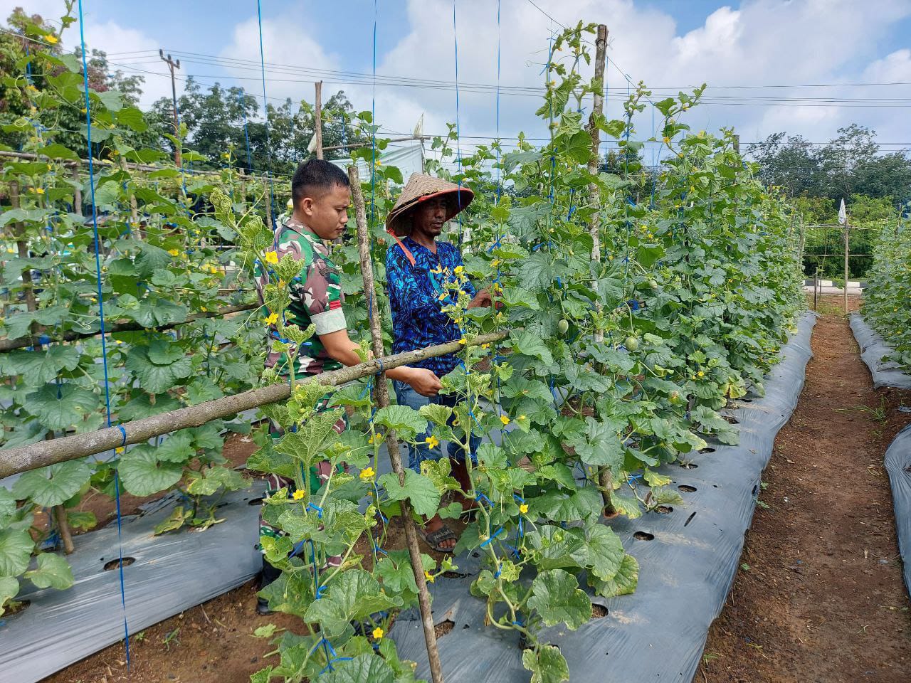Teluk Kuantan – Babinsa Koramil 02/Kuantan Tengah Dalam melakukan kegiatan pendampingan Hanpangan (ketahanan pangan) terhadap petani di wilayah binaannya Praka Achmad Kamal selaku Babinsa Desa Beringin Taluk Kec. Kuantan Tengah Kab. Kuansing, membantu Petani merawat Kebun Gambas / sering di sebut Pitulo oleh warga Desa Beringin Taluk dan beberapa sayuran lainnya, Kamis (28/08/2025).