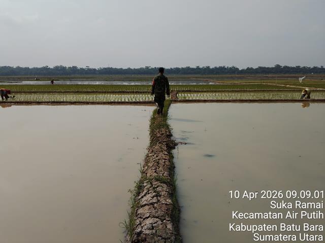 Dalam kesempatan ini seperti yang dilakukan oleh Personel Bintara Pembina Desa (Babinsa) Koramil 02/Air Putih jajaran Kodim 0208/Asahan Serda Indra turun kewilayah binaan untuk turut serta melaksanakan kegiatan pendampingan Hanpangan, dengan melaksanakan Pendampingan kepada petani menanam padi agar tercipta suwasembada pangan, kegiatan Ketahanan Pangan membantu pembagi bibit padi kepada padi pekerja tanam padi lahan sawah milik Bapak B Aritonang seluas 8 rante, kegiatan tersebut bertujuan untuk menciptakan hubungan yang humanis antara babinsa dengan warga binaan, Babinsa senantiasa menghimbau dan memberikan Motivasi agar petani lebih semangat dan kreatif dalam bertani agar mendapat hasil yang memuaskan, bersama dengan Ibu B Aritonang (Pekerja Lahan) dan Ibu Sirait (Pekerja Lahan), kegiatan tersebut yang dilaksanakan bertempat di Desa Sukaramai Kecamatan Air Putih Kabupaten Batu Bara, Jumat (10/04/2026).
