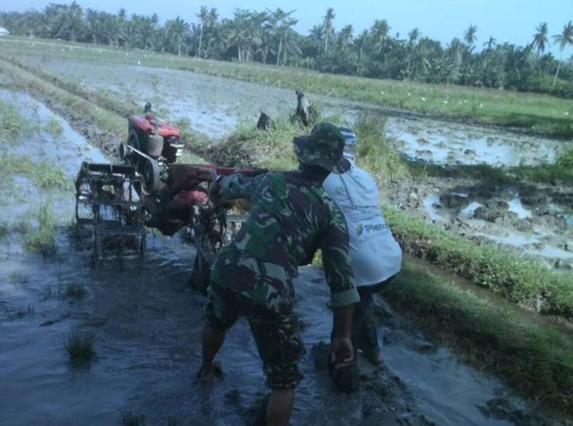 Sukseskan Swasembada Pangan Dampingi Petani Olahan Lahan Sawah Dilakukan Personel Koramil 01/MD Kodim 0208/Asahan