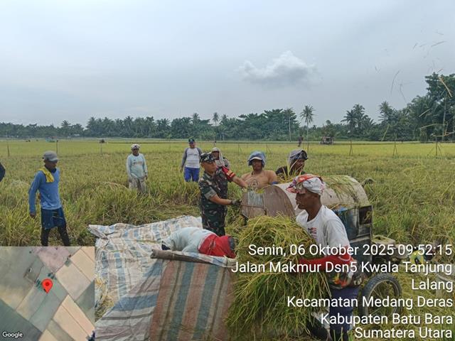 Batu Bara  |  Dalam rangka wujud dukungan TNI khususnya prajurit kewilayahan yaitu Babinsa dalam mendukung ketahanan pangan, dengan Semangat ikut serta terjun langsung ke sawah bantu para petani desa binaannya saat memanen padi, inilah yang dilakukan oleh Babinsa kepada para petani warga desa binaannya. Dengan penuh rasa semangat, dalam kesempatan ini seperti yang dilakukan oleh Personel Bintara Pembina Desa (Babinsa) Koramil 02/Air Putih jajaran Kodim 0208/Asahan Sertu Wardoyo turun kewilayah binaan untuk melaksanakan kegiatan Komsos dan sekaligus membantu Panen Padi, dengan melaksanakan kegiatan Hanpangan membantu proses panen padi seluas 27 rante milik Bapak Dedy, bersama dengan Bapak Iqbal PPL Desa Kuala Tanjung, Bapak Dedy pemilik sawah dan masyarakat yang membantu memanen, kegiatan tersebut yang dilaksanakan bertempat di Desa Kuala Tanjung Kecamatan Sei Suka Kabupaten Batu Bara, Senin (06/10/2025).