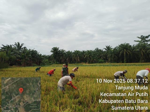 Batu Bara | Dalam upaya mendukung program Swasembada Pangan Nasional, dalam kesempatan ini seperti yang dilakukan oleh Personel Bintara Pembina Desa (Babinsa) Koramil 02/Air Putih jajaran Kodim 0208/Asahan Serda Supardi turun kewilayah binaan untuk melaksanakan kegiatan Panen Padi kegiatan Hanpangan, membantu petani memanen padi di lahan pak sanusi seluas 6 rante, turun langsung ke sawah untuk membantu petani dalam proses panen padi. kegiatan ini juga merupakan bentuk kepedulian TNI terhadap kesejahteraan petani serta upaya meningkatkan produksi pangan di wilayah tersebut, dengan penuh semangat Babinsa bersama petani setempat memanen padi yang telah memasuki masa panen, bersama dengan Bapak Sanusi, Bapak Jalaludin dan Bapak Edi, kegiatan tersebut yang dilaksanakan bertempat di Desa Tanjung Muda Kecamatan Air Putih Kabupaten Batu Bara, Senin (10/11/2025).