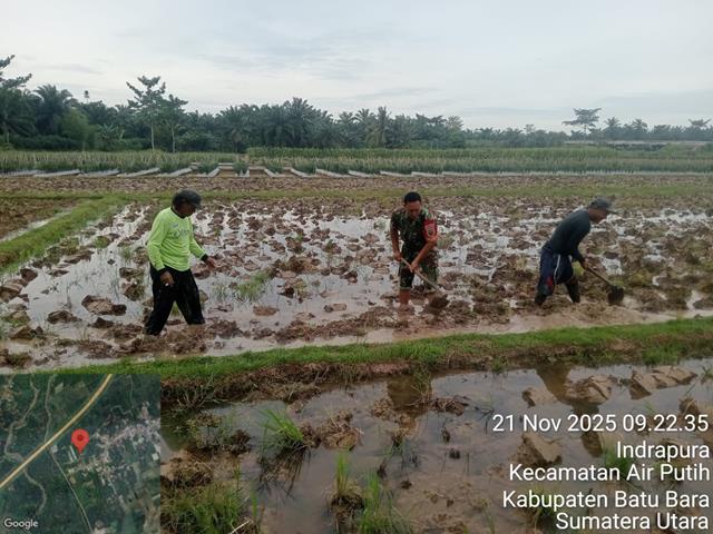 Batu Bara  |  Dalam rangka untuk mengejar meningkatnya nilai produksi bahan pangan, para Babinsa tak henti-hentinya terus mendampingi para petani, baik pengawasan pembagian alsintan, benih, pupuk serta pengolahan lahan sawah yang ada, Babinsa tetap bersemangat tak kenal waktu dan lelah, dala kesempatan ini seperti yang dilakukan oleh Personel Bintara Pembina Desa (Babinsa) Koramil 02/Air Putih jajaran Kodim 0208/Asahan Sertu Ngatiran turun kewilayah binaan untuk turut serta mendampingi Petani dalam rangka pengolahan lahan sawah diwilayah desa binaan, kegiatan pendampingan petani dalam program Hanpangan, kegiatan hanpangan membantu petani menamping sawah milik Bapak Satijo seluas 6 Rante, bersama dengan Bapak Satijo (Ppemilik sawah) dan Bapak Riadi, kegiatan tersebut yang dilaksanakan bertempat di Desa Perkotaan Kecamatan Air Putih Kabupaten Batu Bara, Jumat (21/11/2025).