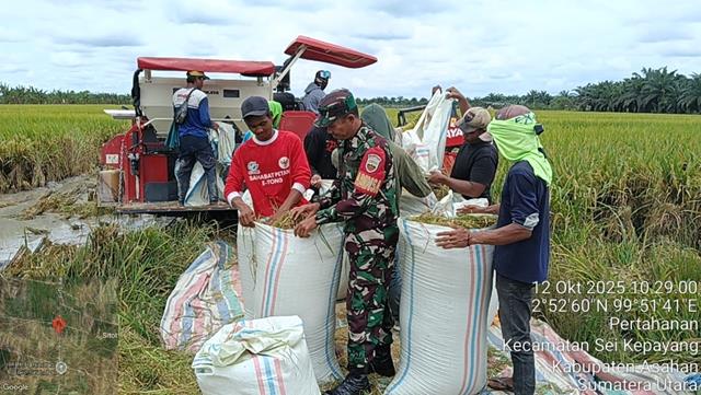 Asahan  |  Dalam rangka wujud dukungan TNI khususnya prajurit kewilayahan yaitu Babinsa dalam mendukung ketahanan pangan, dengan Semangat ikut serta terjun langsung ke sawah bantu para petani desa binaannya saat memanen padi, inilah yang dilakukan oleh Babinsa kepada para petani warga desa binaannya. Dengan penuh rasa semangat, dalam kesempatan ini seperti yang dilakukan oleh Personel Bintara Pembina Desa (Babinsa) Koramil 10/Sei Kepayang jajaran Kodim 0208/Asahan Serka Dadi Priadi turun kewilayah binaan untuk melaksanakan kegiatan Komsos dan sekaligus membantu Panen Padi, kegiatan pendampingan petani memanen padi menghasilkan yang baik dan bermutu Hanpangan, kegiatan ketahanan pangan membantu masyarakat turun kesawah memanen padi bersama warga desa binaan, bersama dengan Bapak Rahmat, Bapak Sitorus, Bapak Manan dan Bapak Rohmad, kegiatan tersebut yang dilaksanakan bertempat di Desa Pertahanan Kecamatan Sei Kepayang Kabupaten Asahan, Minggu (12/10/2025).