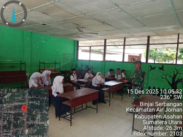 Dalam rangka untuk meningkatkan kedisiplinan dan karakter, membentuk siswa agar memiliki disiplin, tanggung jawab, dan kepribadian yang kuat, untuk menciptakan lingkungan yang kondusif, membangun sinergitas antara TNI, sekolah, dan masyarakat untuk menciptakan lingkungan yang aman dan harmonis, dalam kesempatan tersebut seperti halnya yang dilakukan oleh Personel Bintara Pembina Desa (Babinsa) Koramil 07/Air Joman jajaran Kodim 0208/Asahan Serma Syahdan turun kewilayah binaan untuk melaksanakan kegiatan Puanter, kegiatan Binwanmil kepada siswa, dengan melaksanakan Wawasan Kebangsaan, bersama dengan Siswa/i SMP Daerah Swasta, kegiatan tersebut yang dilaksanakan bertempat di SMP Daerah Swasta Lingkungan V Kelurahan Binje Serbangan Kecamatan Air Joman Kabupaten Asahan, Senin (15/12/2025).