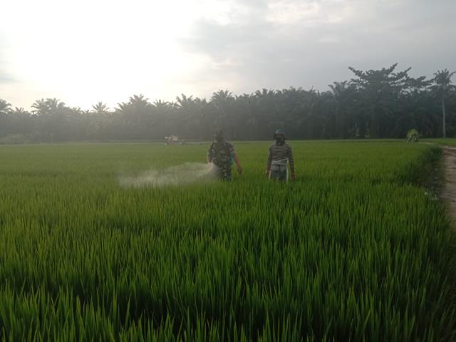 Pada kesempatan tersebut Babinsa mengatakan dengan melaksanakan upaya khusus (Upsus) pendampingan kepada pertanian membantu petani dalam membasmi hama padi sawah, Babinsa menuturkan kali ini babinsa juga ikut ke sawah untuk menyemprot tanaman padi, Penyemprotan ini guna mengantisipasi hama ulat maupun wereng, selain itu juga untuk memberikan kesuburan terhadap batang padi serta menghilangkan rumput ilalang yang tumbuh di sekitar tanaman padi. Menurutnya, keberhasilan dalam pertanian akan berdampak positif bagi kehidupan masyarakat. Dengan begitu masyarakat akan memenuhi persediaan pangan dan kesejahteraan masyarakat akan terjamin, jelas Babinsa Kopda Sertu Fahmi.