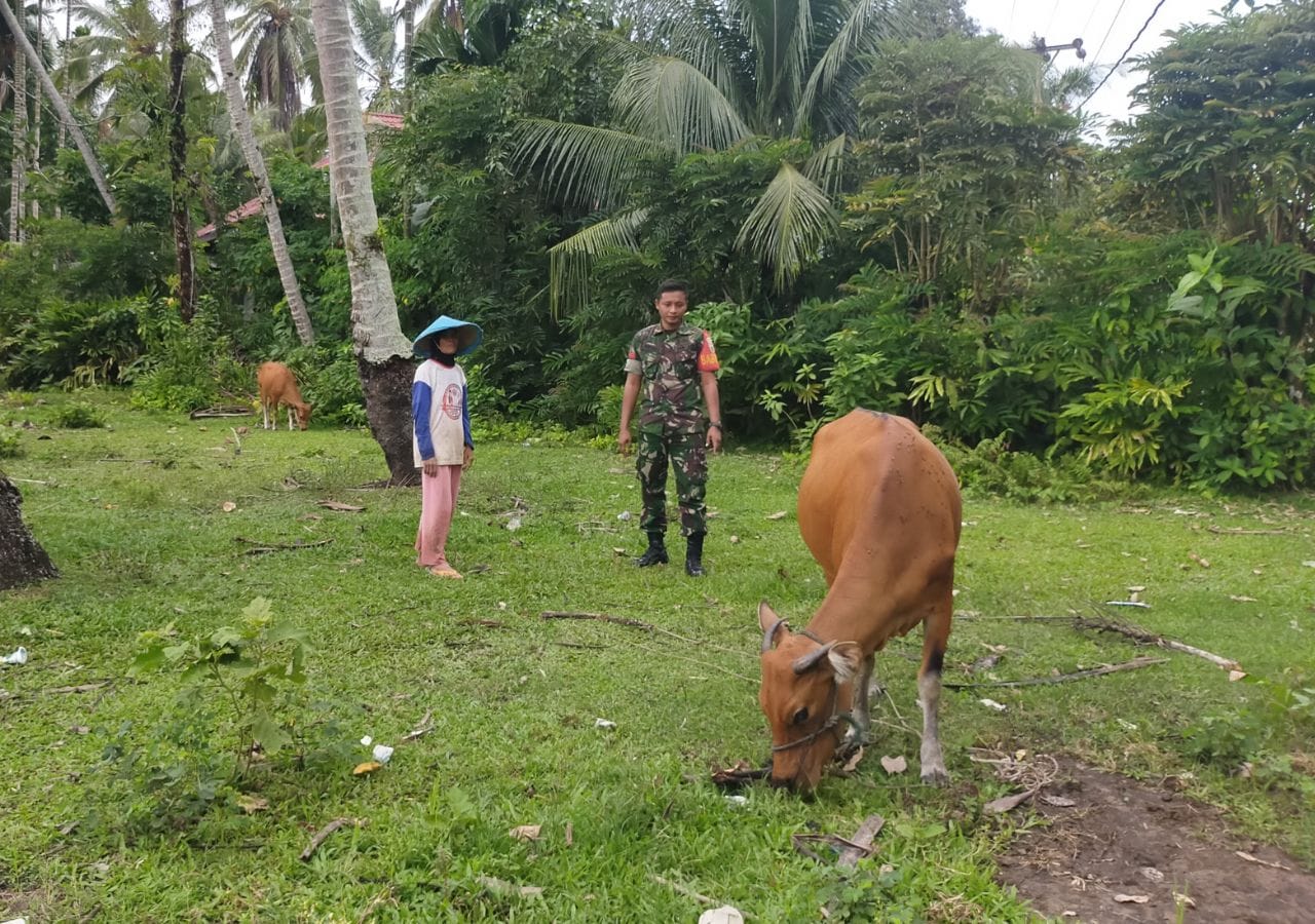 Babinsa Koramil 08/KM Kodim 0302/Inhu Praka Inel melaksanakan pemantauan sekaligus lakukan pengecekan kesehatan ternak sapi milik warga desa binaan yang berlokasi Di Desa Tanjung medang Kecamatan hulu kuantan Kabupaten Kuantan Singingi. Kamis ( 06/11/2025 ).