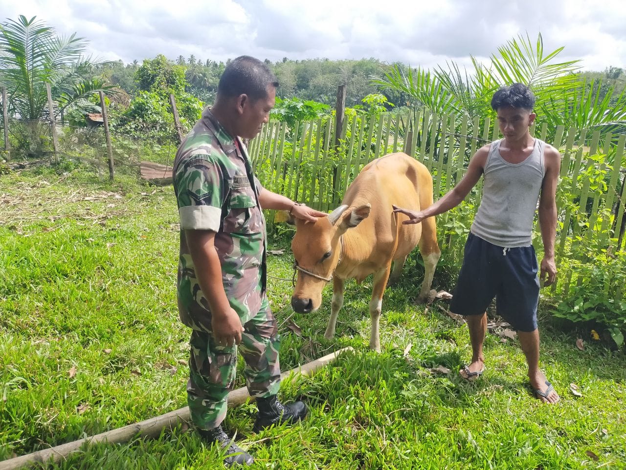 Babinsa Koramil 08/KM Kodim 0302/Inhu Serda Ari Waluyo melaksanakan pemantauan sekaligus lakukan pengecekan kesehatan ternak sapi milik warga desa binaan yang berlokasi Di Desa Pulau Mungkur Kecamatan Gunung Toar Kabupaten Kuantan Singingi. Senin ( 29/12/2025 ).
