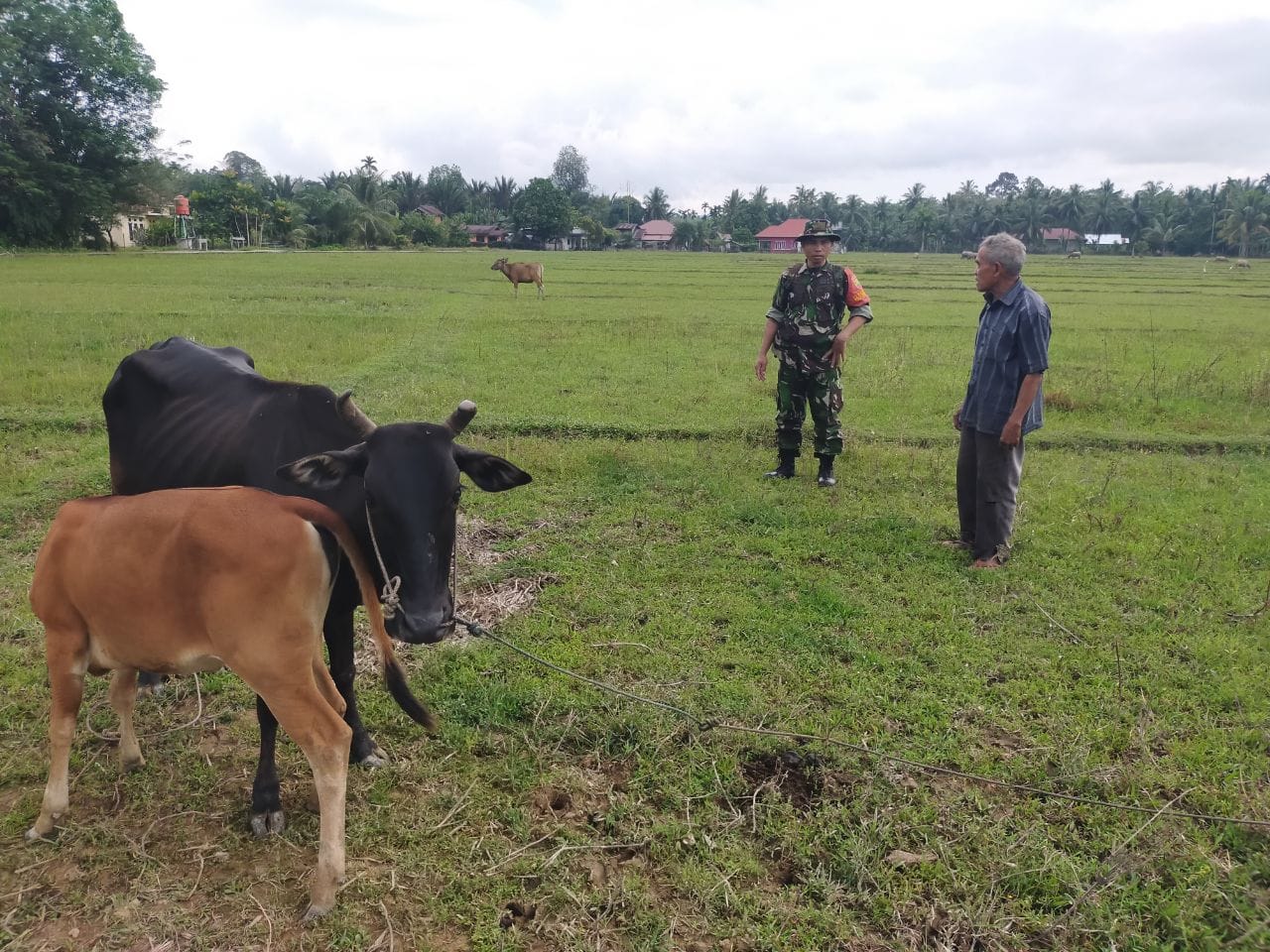 Babinsa Koramil 08/KM Kodim 0302/Inhu Serda Ari Waluyo melaksanakan pemantauan sekaligus lakukan pengecekan kesehatan ternak sapi milik warga desa binaan yang berlokasi Di Desa Muaro Tombang Kecamatan Kuantan Mudik Kabupaten Kuantan Singingi. Kamis ( 08/01/2026 ).