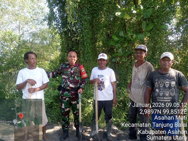 Asahan | Kegiatan gotong-royong ini merupakan sarana kebersamaan antara Anggota Babinsa dan warga wilayah binaan demi membantu tercapainya kenyamanan desa serta kebersihan desa binaan, dengan melaksanakan karya bakti pembersihan parit, badan jalan dari rumput liar tersebut untuk tetap menjaga hubungan Babinsa dengan masyarakat, khususnya warga binaannya. Dalam kegiatan sudah menjadi tugas dan tanggung jawab bagi Babinsa untuk bisa memelihara hubungan yang baik bersama warganya. Salah satunya melalui karya bakti dan bergotong royong bersama masyarakat binaan, agar tercipta Kemanunggalan TNI dan Rakyat.