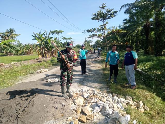 Gotong royong Pembersihan jalan kegiatan tersebut bertujuan tetap menjaga hubungan yang humanis, dengan membantu penimbunan jalan yg berlubang akibat curah hujan yang tinggi, untuk memelihara dan menjalin hubungan baik Antara Babinsa dan masyarakat untuk meningkatkan rasa kepedulian terhadap masyarakat pada umumnya, kegiatan bakti TNI gotong royong bersama masyarakat penimbunan jalan yang rusak berlobang kegiatan Babinsa saling bersinergi bekerja sama bersama warga masayrakat untuk kelancaran pengendara di jalan, kegiatan bertujuan untuk menimbun jalan yang berlobang lobang agar tidak tergenang air pada saat musim penghujan. sehingga masyarakat yang melintasi jalan tersebut dapat melaluinya dengan lancar serta terjalin hubungan yang baik dan harmonis antara warga Desa binaan dengan Babinsa sehingga tugas dan kegiatan Babinsa dapat tercapai dengan baik, dalam kegiatan tersebut Babinsa memberikan arahan kepada masyarakat tentang pentingnya kegiatan gotong royong, kegiatan gotong royong bersama warga membersihkan jalan, dan memperbaiki jalan dengan menimbun jalan yang berlobang dengan batu.