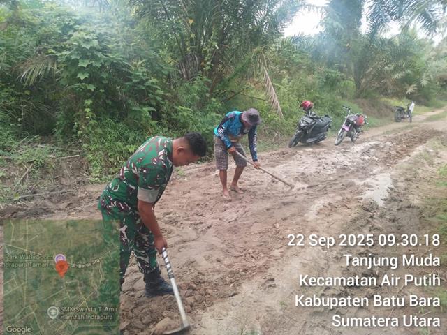 Dengan melaksanakan kegiatan Marharoan Bolon (Gotong-royong) penimbunan badan jalan yang berlobang tersebut untuk jalan penghubung tersebut, dalam pelaksanaan kegiatan Gotong royong menimbun jalan yang berlubang bersama dengan warga masyarakat binaan, dalam kesempatan ini seperti yang dilakukan oleh Personel Bintara Pembina Desa (Babisna) Koramil 02/Air Putih jajaran Kodim 0208/Asahan Serda Supardi turun kewilayah binaan untuk melaskanakan kegiatan gotong royong bersama masyarakat desa binaan, Gotong royong Pembersihan jalan kegiatan tersebut bertujuan tetap menjaga hubungan yang humanis, Gotong royong meratakan jalan yang berlubang supaya pengguna jalan lebih nyaman dan mengurangi kecelakaan, bersama dengan Bapak Luhut Manurung, Bapak Sartono dan Bapak Andy, kegiatan tersebut yang dilaksanakan bertempat di Desa Tanjung Muda Kecamatan Air Putih Kabupaten Batu Bara, Senin (22/09/2025).
