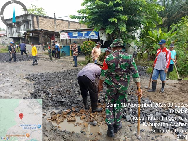 Dengan melaksanakan kegiatan Marharoan Bolon (Gotong-royong) penimbunan badan jalan yang berlobang tersebut untuk jalan penghubung tersebut, dalam pelaksanaan kegiatan Gotong royong menimbun jalan yang berlubang bersama dengan warga masyarakat binaan, dalam kesempatan ini seperti yang dilakukan oleh Personel Bintara Pembina Desa (Babisna) Koramil 13/Buntu Pane jajaran Kodim 0208/Asahan Sertu Bedi Saputra turun kewilayah binaan untuk melaskanakan kegiatan gotong royong bersama masyarakat desa binaan, Gotong royong Pembersihan jalan kegiatan tersebut bertujuan tetap menjaga hubungan yang humanis, Gotong royong bersama warga binaan membersihkan Memperbaiki jalan yamg berlobang sebagai bentuk kepedulian Babinsa terhadap wilayah binaan guna dapat membaur ditengah tengah masyarakat serta memelihara komunikasi yang selama ini terjalin dengan baik, Bersama dengan Kades Desa Teladan Bapak Darwin, Kadus V Bapak Tarto dan Masyarakat Dusun V, . kegiatan tersebut yang dilaksanakan bertempat di Dusun V Desa Teladan Kecamatan Tinggi Raja Kabupaten Asahan, Senin (10/11/2025).