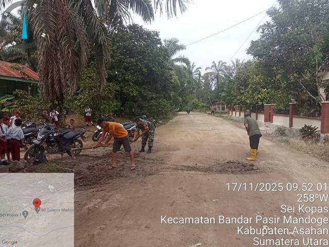 Dengan melaksanakan kegiatan Marharoan Bolon (Gotong-royong) penimbunan badan jalan yang berlobang tersebut untuk jalan penghubung tersebut, dalam pelaksanaan kegiatan Gotong royong menimbun jalan yang berlubang bersama dengan warga masyarakat binaan, dalam kesempatan ini seperti yang dilakukan oleh Personel Bintara Pembina Desa (Babisna) Koramil 14/Bandar Pasir Mandoge jajaran Kodim 0208/Asahan Kopda Suyanto bersama Masyarakat melaksanakan kegiatan gotong royong untuk menimbun jalan yang berlubang agar aktivitas warga yang melintas tetap aman, kegiatan tersebut dilaksanakan  dengan tujuan menjalin  kebersamaan antara Baninsa dan warga sehingga masyarakat dapat selalu merasakan kehadiran TNI dan juga dapat menunjang tugas-tugas pokok TNI, bersama dengan Bapak Tugino, Bapak Iyan Nainggolan dan Bapak Ahmad Sitorus, kegiatan tersebut yang dilaksanakan bertempat di Dusun X Desa Sei Kopas Kecamatan Bandar Pasir Mandoge Kabupaten Asahan, Senin (17/11/2025).