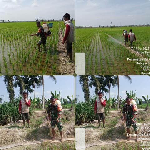 Dalam kesempatan ini seperti yang dilakukan oleh Personel Bintara Pembina Desa (Babinsa) Koramil 10/Sei Kepayang jajaran Kodim 0208/Asahan Serda Ardi G Silalahi turun kewilayah binaan untuk turut serta melaksanakan pendampingan Hanpangan jenis tanaman padi, kegiatan Hanpangan membantu menyemprot hama jenis ulat guna untuk pertumbuhan padi agar tumbuh lebih baik, kegiatan Hanpangan membantu Petani menyemprot hama ulat daun padi, kegiatan pendampingan ketahanan pangan dengan ikut serta membantu petani dalam penyemprotan hama, kegiatan bertujuan untuk membasmi hama yang mengganggu pertumbuhan padi sehinga padi dapat tumbuh lebih baik dan bisa menghasilkan panen yang maksimal, kegiatan tersebut yang dilaksanakan bertempat di Lahan Bapak Beni Azrul Dusun 1 Desa Pertahanan Kecamatan Sei Kepayang Kabupaten Asahan, Rabu (27/08/2025).
