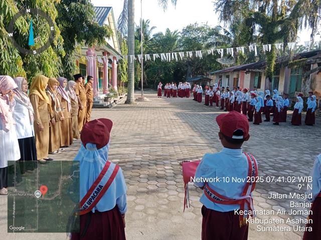 Dalam rangka menanamkan rasa cinta tanah air sejak dini, dalam kesempatan ini seperti halnya yang dilakukan oleh Personel Bintara Pembina Desa (Babinsa) Koramil 07/Air Joman jajaran Kodim 0208/Asahan Sertu Dahrum turun kewilayah binaan untuk melaksanakan kegiatan Wawasan Kebangsaan sekaligus Menjadi Pembina Upacara Bendera, melaksanakan Wanwil yaitu Upacara Bendera sekaligus Menjadi Pembina Upacara Bendera, giat ini bertujuan pemberian materi wawasan kebangsaan, untuk membentuk karakter para siswa-siswi dengan memupuk jiwa Nasionalisme sekaligus untuk membina kedisiplinan dan mematuhi peraturan sekolah, Bersama dengan Bapak Zainal SPd (Kepala Sekolah), serta Guru UPTD SDN 010245 Pasar Lembu, Bapak Zulham Efendi (Korwil Kecamatan Air Joman) dan para Guru Pengajar, B kegiatan tersebut yang dilaksanakan bertempat di UPTD SDN 014697 Dusun 6 Desa Banjar Kecamatan Air Joman Kabupaten Asahan, Senin (10/11/2025).