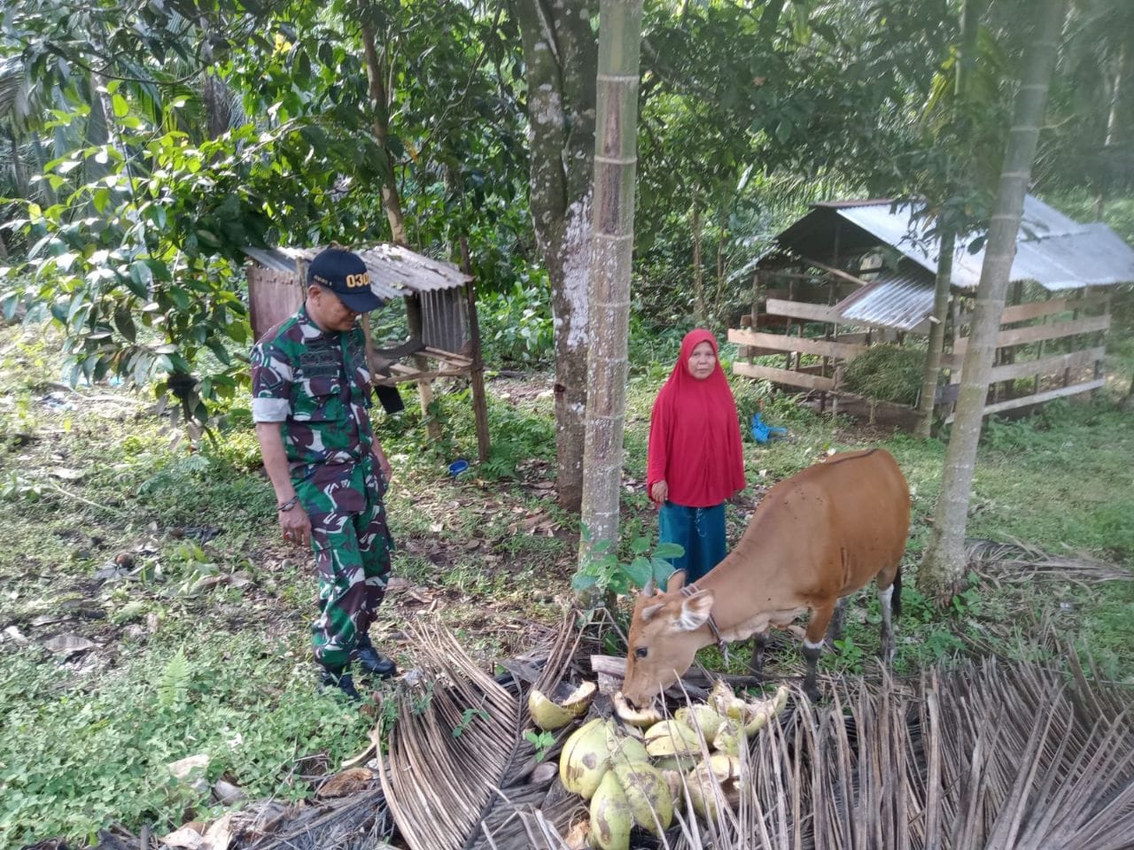 Babinsa Koramil 08/KM Kodim 0302/Inhu Serda Ari Waluyo melaksanakan sosialisasi dan pengecekan hewan ternak milik warga dalam rangka mewaspadai wabah penyakit mulut dan kuku (PMK) pada ternak sapi di wilayah binaannya Di Desa Siberobah kecamatan Gunung Toar Kabupaten Kuantan Singingi. Selasa ( 23/12/2025 ).