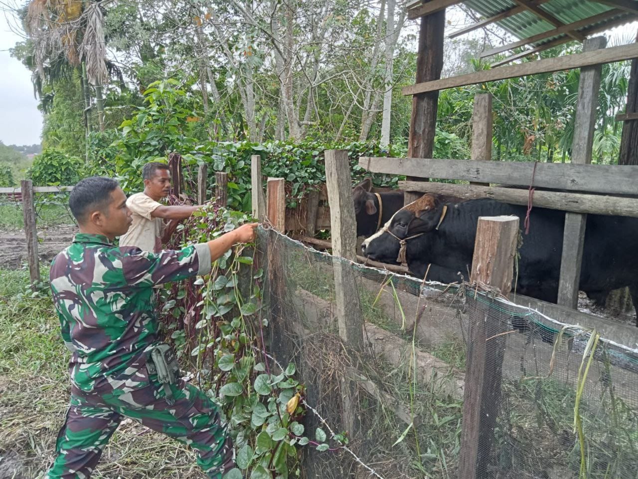 Babinsa Koramil 08/KM Kodim 0302/Inhu Serda Ari Waluyo melaksanakan sosialisasi dan pengecekan hewan ternak milik warga dalam rangka mewaspadai wabah penyakit mulut dan kuku (PMK) pada ternak sapi di wilayah binaannya Di Desa Pulau Mungkur kecamatan Gunung Toar Kabupaten Kuantan Singingi. Selasa ( 10/03/2026 ).