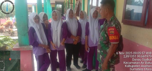 Asahan | Untuk menumbuhkan jiwa patriotisme terhadap generasi muda penerus bangsa, dalam kesempatan ini seperti yang dilakukan oleh Personel Bintara Pembina Desa (Babinsa) Koramil 12/Air Batu jajaran Kodim 0208/Asahan Pelda Arif W turun kewilayah binaan untuk melaksanakan kegiatan Bintahwil kepada Siswa-siswi sekaligus melaksanakan Komunikasi sosial Tentang wawasan kebangsaan dan bela negara kepada siswa Pramuka SMK swasta Elsalder yang sedang Melaksanakan Istirahat di Lapangan Sekolah Desa Danau Sijabut, bersama dengan Siswi Desi, Siswi Rani, Siswi Inda, Siswa Ita, Siswa Taing dan Siswa Rati, kegiatan tersebut yang dilaksanakan bertempat di Dusun VII Kecamatan Air Batu Kabupaten Asahan, Kamis (06/11/2025).