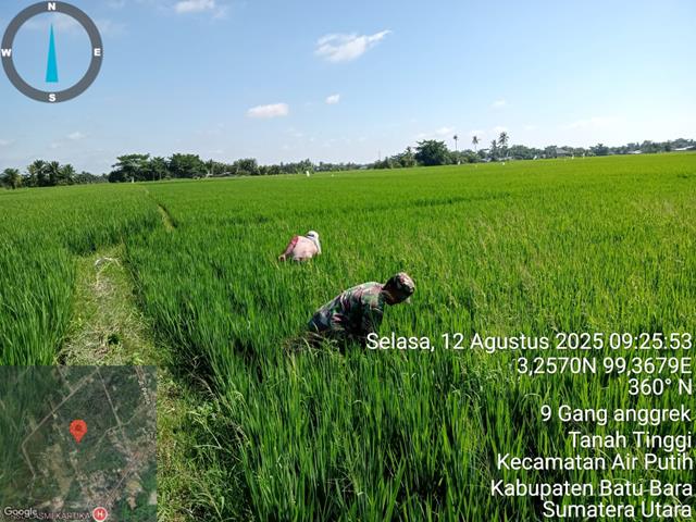 Batu Bara  |  Dalam rangka untuk memelihara dan menjalin hubungan baik dengan  masyarakat serta untuk meningkatkan Sinergitas antara TNI dengan masyarakat, Gulma ataupun rumput liar menjadi salah satu kendala bagi para petani padi dalam memperoleh hasil panen yang maksimal, karena keberadaan gulma sangat mengganggu tanaman padi pada masa pertumbuhan hingga masa pematangan, jika keberadaan gulma tidak dibasmi atau dilakukan penyiangan maka akan mengakibatkan tanaman padi kekurangan unsur hara, air dan cahaya sehingga berdampak pada menurunnya hasil panen, dalam kesempatan ini seperti yang dilakukan oleh Personel Bintara Pembina Desa (Babinsa) Koramil 02/Air Putih jajaran Kodim 0208/Asahan Pelda Sunardy turun kewilayah binaan untuk melaksanakan kegiatan pendampingan petani membersihkan/menyabut rumput disawah, dengan memantau dan membantu petani melaksanakan mencabut rumput disawah milik Bapak Gunawan yang menggangu pertumbuhan tanaman padi seluas 5 rante, kegiatan tersebut yang dilaksanakan bertempat di Desa Tanah Tinggi Kecamatan Air Putih Kabupaten Batu Bara, Selasa (12/08/2025).
